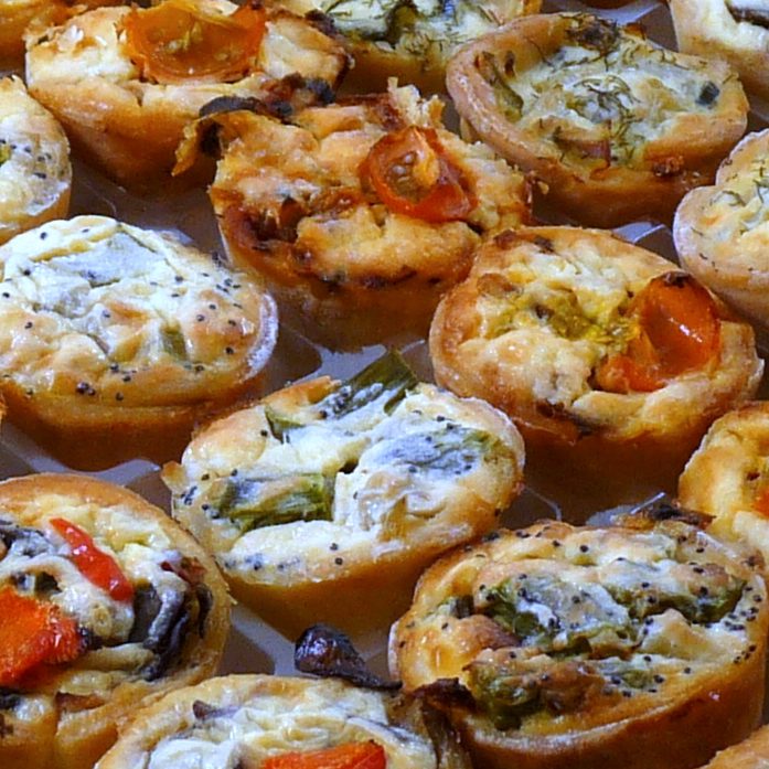 Mooie box met mini quiches in de smaken; Tomaat salami, bospaddestoelen, courgette met brie, zalm prei, asperge blauwkaas.