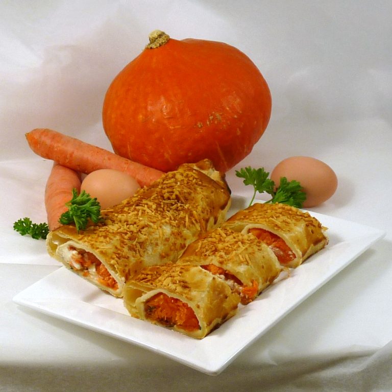 Vegetarisch strudel gevuld met een mix van pompoen en geitenkaas en wortel met kruiden. Prachtig gekleurde vulling, en een smakelijke combinatie!