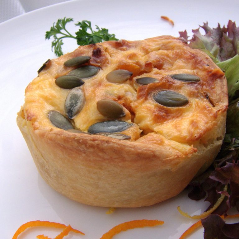 Gebakken hartige 1-persoons taartje, gemaakt met pompoen, wortel, geitenkaas, in een compositie van ei en creme fraiche.