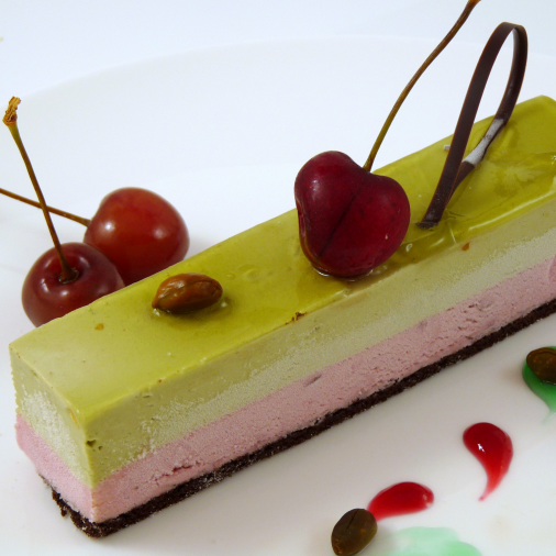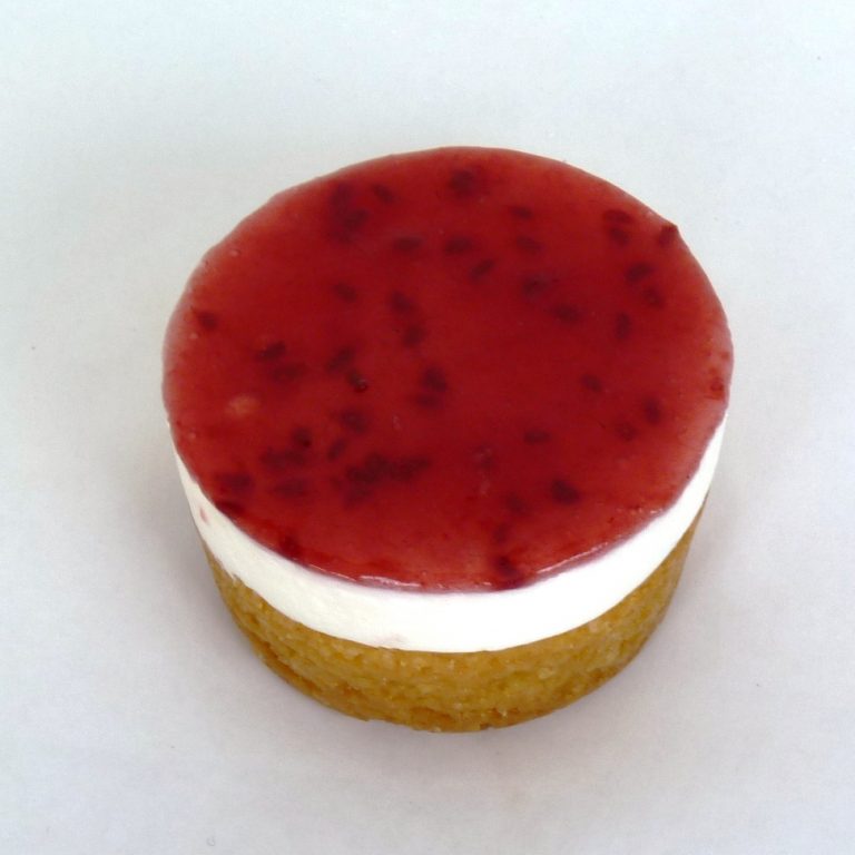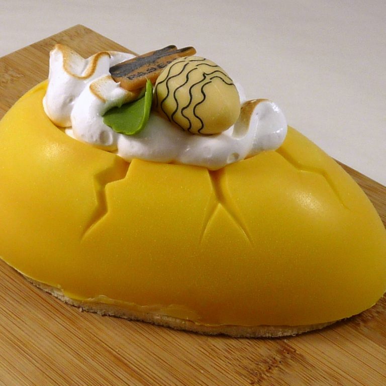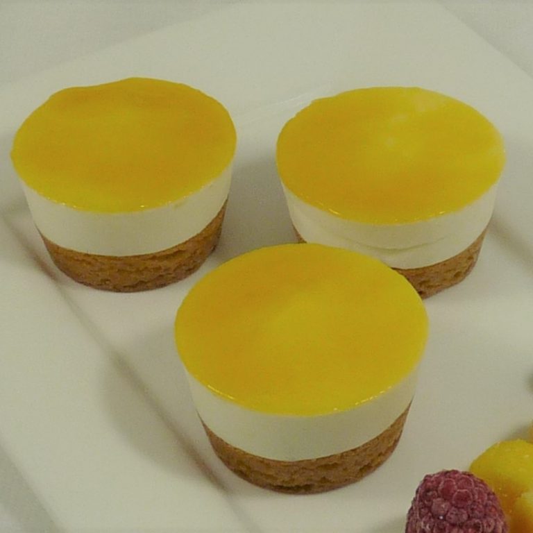 Combinatie van een gebakken bodempje van amandeldeeg, met yoghurt en een spiegel van mango.