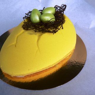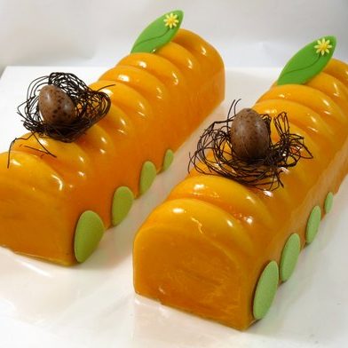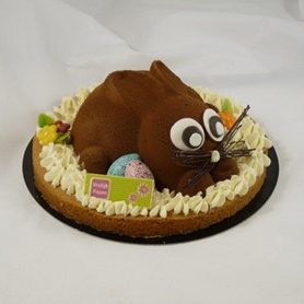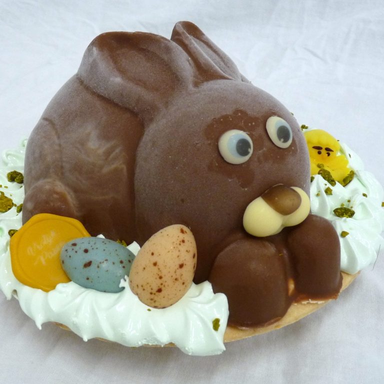 Paaskonijn van romige chocolade bavarois en chocolade afgespoten op een smakelijke hardwener bodem.